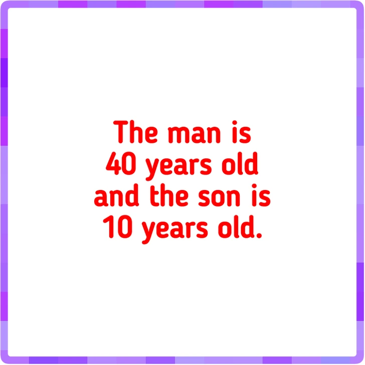 Answer: The man is 40, and his son is 10. In 20 years, the man will be 60, and the son will be 30, making the father twice as old as the son.