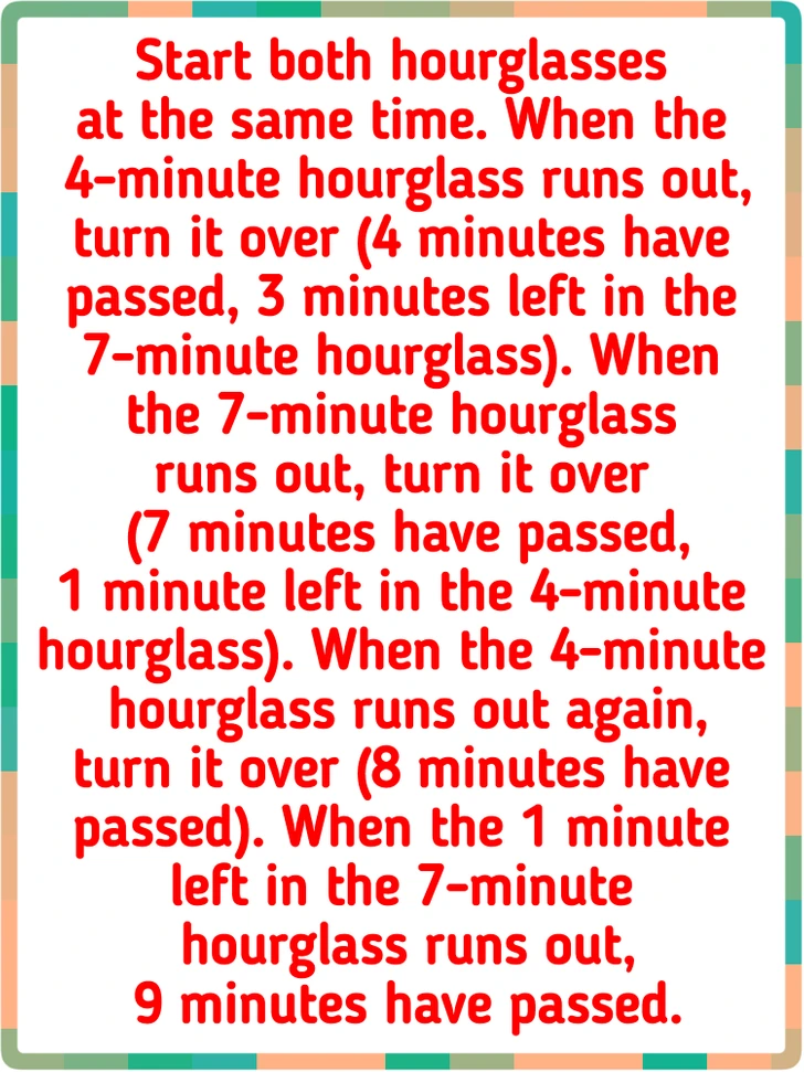 Answer: Start both hourglasses at the same time. When the 4-minute hourglass runs out, flip it. When the 7-minute hourglass runs out, flip it. The 4-minute hourglass will run out again after 8 minutes. When you flip the 4-minute hourglass this second time, it will measure exactly 1 more minute, totaling 9 minutes.