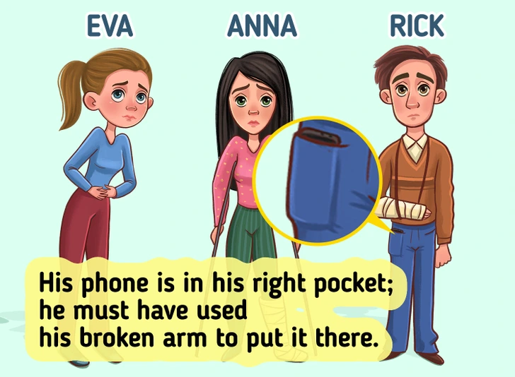 Answer: He has his phone in his right pocket; a genuinely sick person might not think to check these details, revealing he’s faking it.