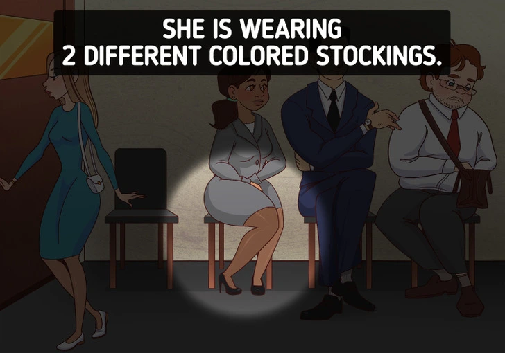 Answer: She’s wearing two different colored stockings, a subtle but unmistakable clue.