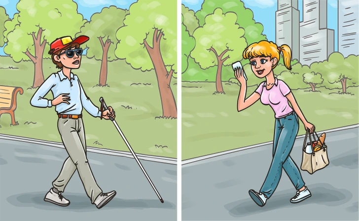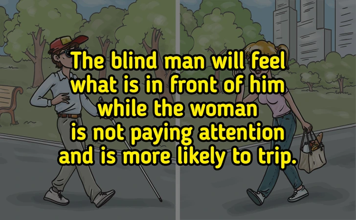 Answer: The woman is more likely to trip because she’s distracted, while the blind man can feel his way forward and stay alert.