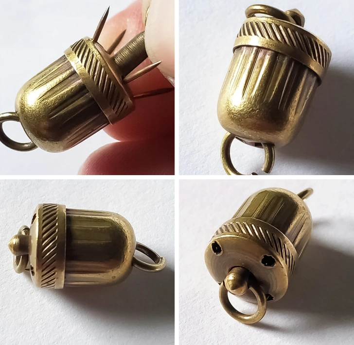 This small copper box was another puzzling find. It’s actually a portable ashtray. Back when smoking was more common, these compact ashtrays were carried in pockets to discreetly dispose of cigarette ash and butts.