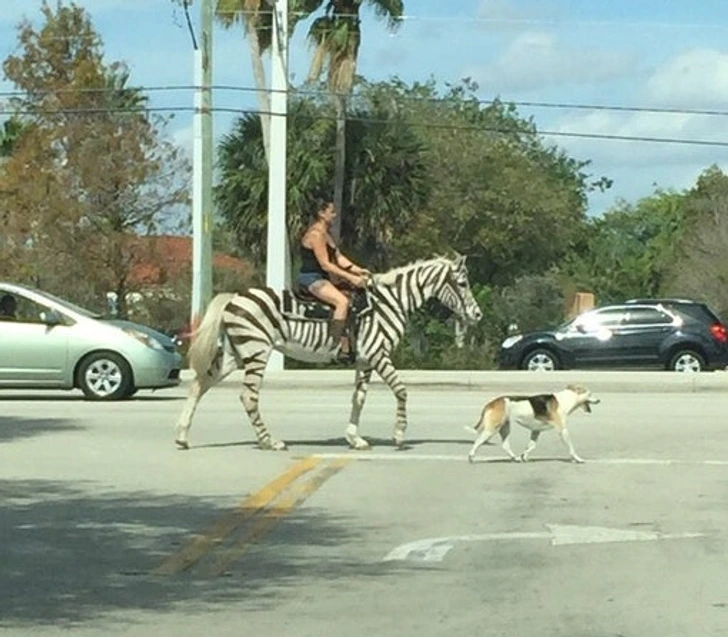 Only in Florida, right? A photo of a woman riding a horse painted like a zebra walking alongside a dog is bound to make you do a double-take. It’s one of those “only in America” moments that’s as puzzling as it is amusing.