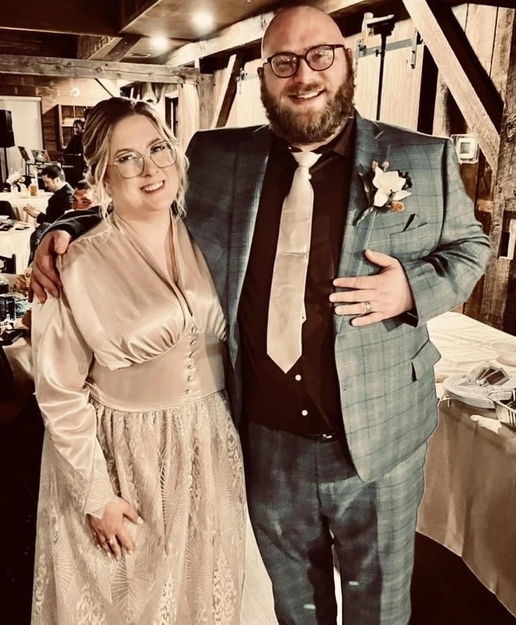 “My mother made my wedding dress from a 1938 pattern. Our wedding theme was film noir/Art Deco, so I wanted a one-of-a-kind dress that reflected that era.” For her big day, she wore a piece that was not only vintage-inspired but also personally crafted, combining sentimental value with old Hollywood glam.