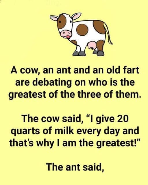 Laughter is one of life’s greatest joys, and sometimes the best jokes are the ones that take an unexpected turn. If you’re ready for a good chuckle, you’re in the right place! Today, we bring you a hilarious debate between a cow, an ant, and an old fart—each convinced they are the greatest of all. What unfolds is a comedy-filled exchange that will leave you grinning from ear to ear.
