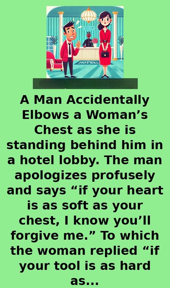 He was standing near the reception desk, maybe waiting for an elevator or just people-watching, when he casually stepped backward. Unfortunately, he didn’t notice the woman directly behind him—and his elbow landed squarely on her chest.