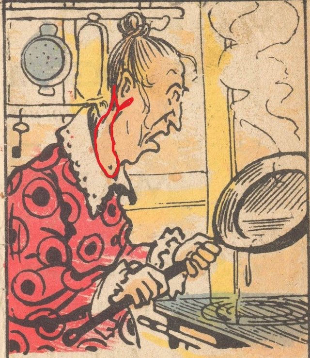 The fish is cleverly disguised along the woman’s neck—curved and colored in such a way that it blends into her skin and the shadows around her. It’s not jumping out of the pan. It’s not hiding behind the stove. It’s right there, hiding in plain sight.