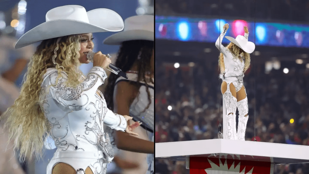 Beyoncé’s appearance at Houston’s NRG Stadium was nothing short of spectacular. Dressed in a stunning white cowboy hat and a glimmering bodysuit, she performed a medley of hits from her Cowboy Carter album, including 16 Carriages, Blackbird, Levii’s Jeans, and Texas Hold’ Em. Broadcast live on Netflix, the performance doubled as a global celebration of her artistry and Texan roots.