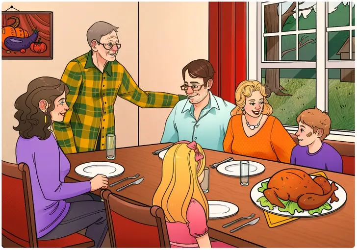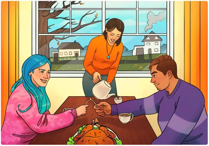 In the next scene, we find a classic Thanksgiving gathering, with two people breaking a wishbone while a third pours tea. But wait—something is missing here. Take a closer look at the teapot the woman is holding. Can you spot what’s wrong? There’s no handle! Somehow, she’s magically pouring tea without it.