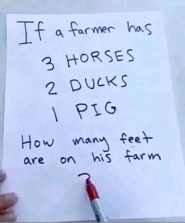 “If a farmer has 3 horses, 2 ducks, and 1 pig, how many feet are on his farm?”