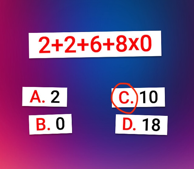 When you first glance at this equation, your brain wants to go left to right and add everything. And that’s exactly why most people end up choosing 0 or 18. It’s easy to overlook that one part that changes everything—the multiplication.