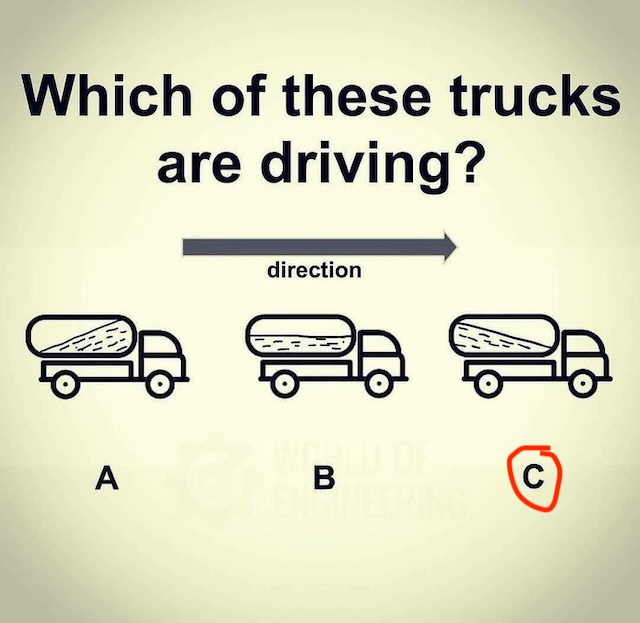 Physics confirms it—Truck C is the moving truck. Its cargo behaves exactly as it should if the truck is in motion.