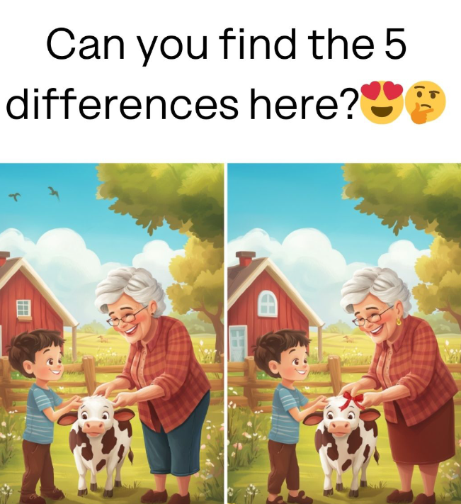 It looks sweet and innocent — a grandma, a child, and a baby cow in a peaceful countryside setting. But don’t let the charm fool you. This vibrant spot-the-difference puzzle is stumping even the sharpest eyes. While it may seem simple at first glance, there are five subtle differences between the two side-by-side images that are easy to miss if you’re not paying close attention.