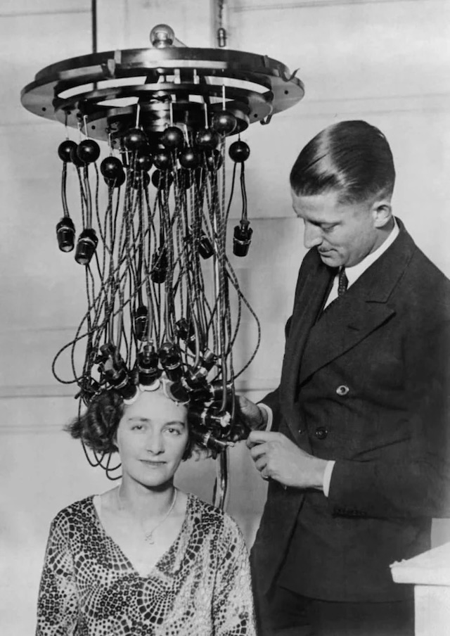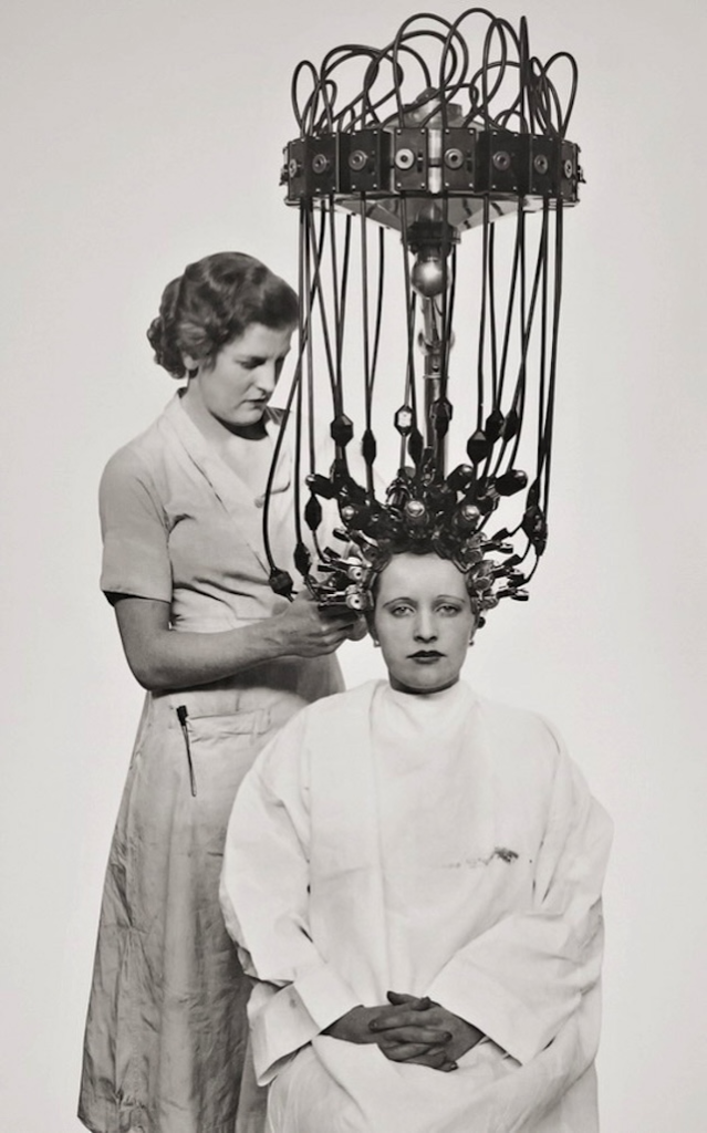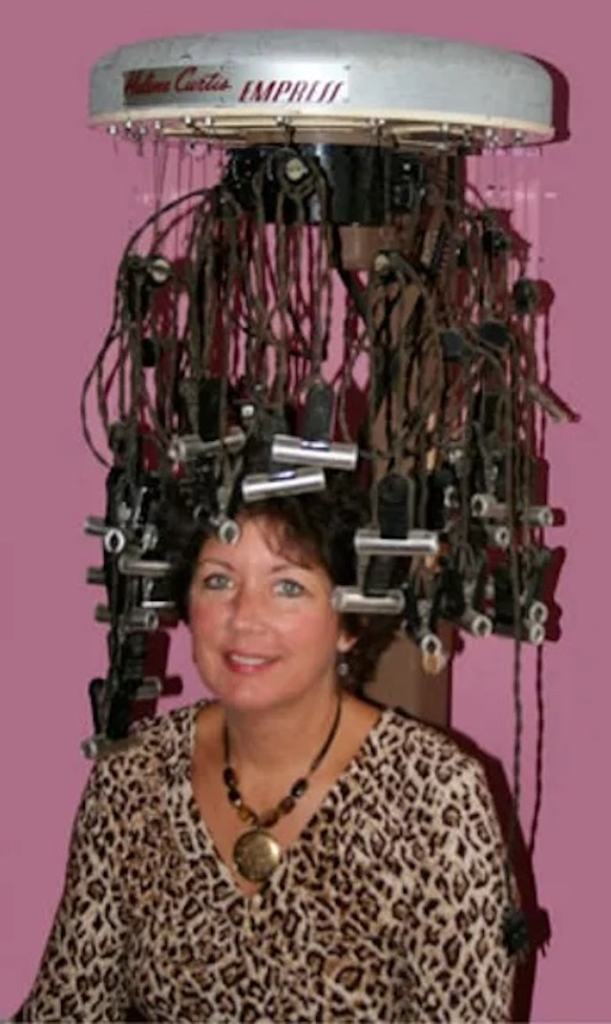 Next, the stylist would wrap sections of the hair around metal curlers or rods, securing them with the machine’s dangling clamps. Each clamp was connected to an electrical source that provided heat to set the curls.