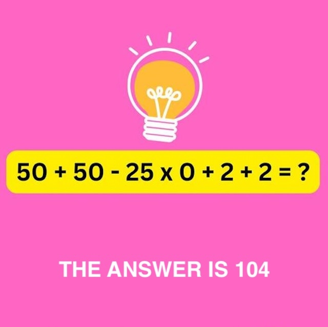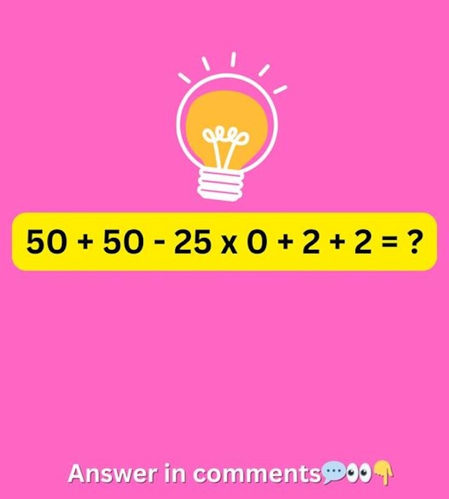 This classic math puzzle is a perfect example of how something simple can still catch you off guard. The equation 50 + 50 – 25 × 0 + 2 + 2 looks harmless, but it’s a sneaky little test of attention and logic.