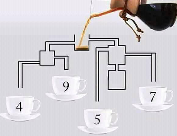 Imagine a scenario where coffee is being poured at the top of a system of interconnected pipes leading to several cups. Your task is to figure out which cup gets filled first. While this may seem straightforward, the key to solving this puzzle is to carefully trace the path of the coffee and identify any blockages that could prevent it from reaching certain cups.