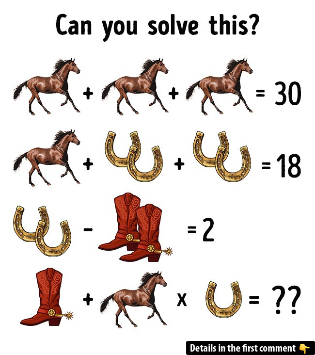 At first glance, this riddle looks like an easy win. It involves horses, horseshoes, and boots—each representing a number. Your job is to figure out the value of each symbol and solve the final equation. But here’s the catch: almost everyone makes the same mistake, and the real answer is not what most people expect.