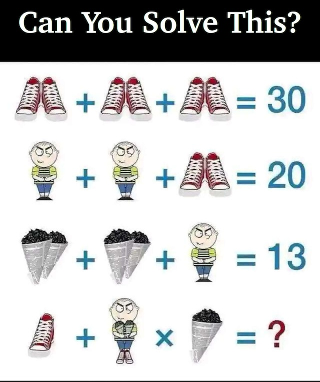 We see three identical images of a pair of shoes adding up to 30. That’s simple: