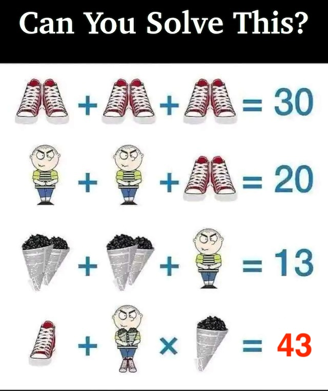 Most people speed through this puzzle and miss small but critical details. The drawings change slightly between equations—sometimes the boy holds extra cones, or he’s suddenly wearing shoes. These might seem minor at first glance, but they completely change the math.