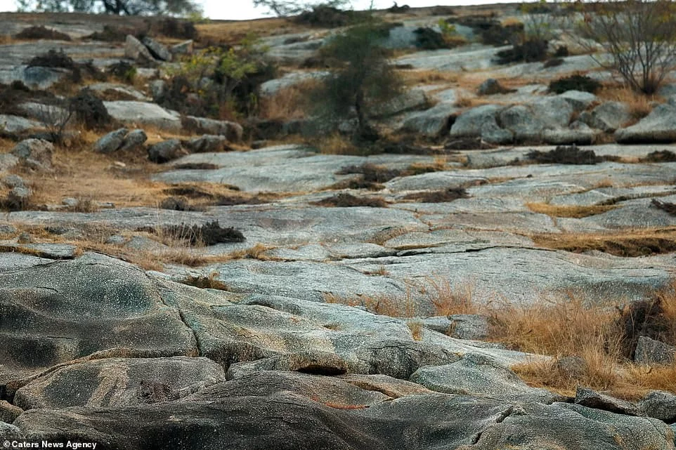 Here’s a rocky scene that appears desolate at first glance, but there’s a frog camouflaged on one of the rocks. Can you locate it quickly?