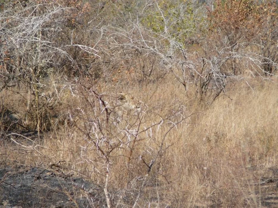 Answer: The lioness is lying low near the bottom-left, blending with the tall grass.