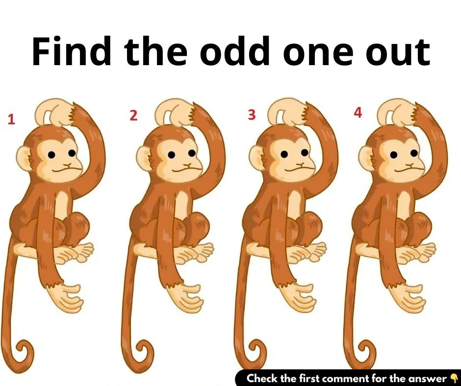 You’ve seen puzzles like this before—simple, lighthearted, and oddly addictive. Four monkeys sit side-by-side, identical in nearly every way. But one little detail makes one of them different. And no, it’s not in the background, or a missing tail, or anything dramatic. The difference is so subtle, you might scroll past it a dozen times before it jumps out.