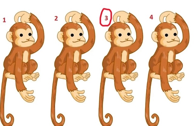 The correct monkey has a subtle flaw in its ear shape. It’s not symmetrical like the others. Monkey number 3 is the odd one out. Its ear is smaller and just slightly different in form.