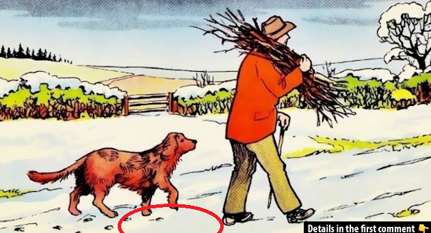 At first glance, the winter scene looks serene. A man in a bright jacket strolls down a snow-covered path with his loyal dog trotting beside him. There’s a bundle of sticks in his arms, snow blanketing the ground, and an air of stillness that feels almost magical. But something doesn’t sit right. Look again—closely.