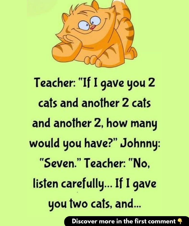 At first glance, Johnny’s answer seems like nothing more than a funny math mistake. But beneath the humor lies a valuable lesson about the importance of context, communication, and understanding. Johnny’s seven cats weren’t a miscalculation—they were a reflection of his reality. And while the teacher’s confusion is relatable, it’s a reminder that assumptions can lead us astray.