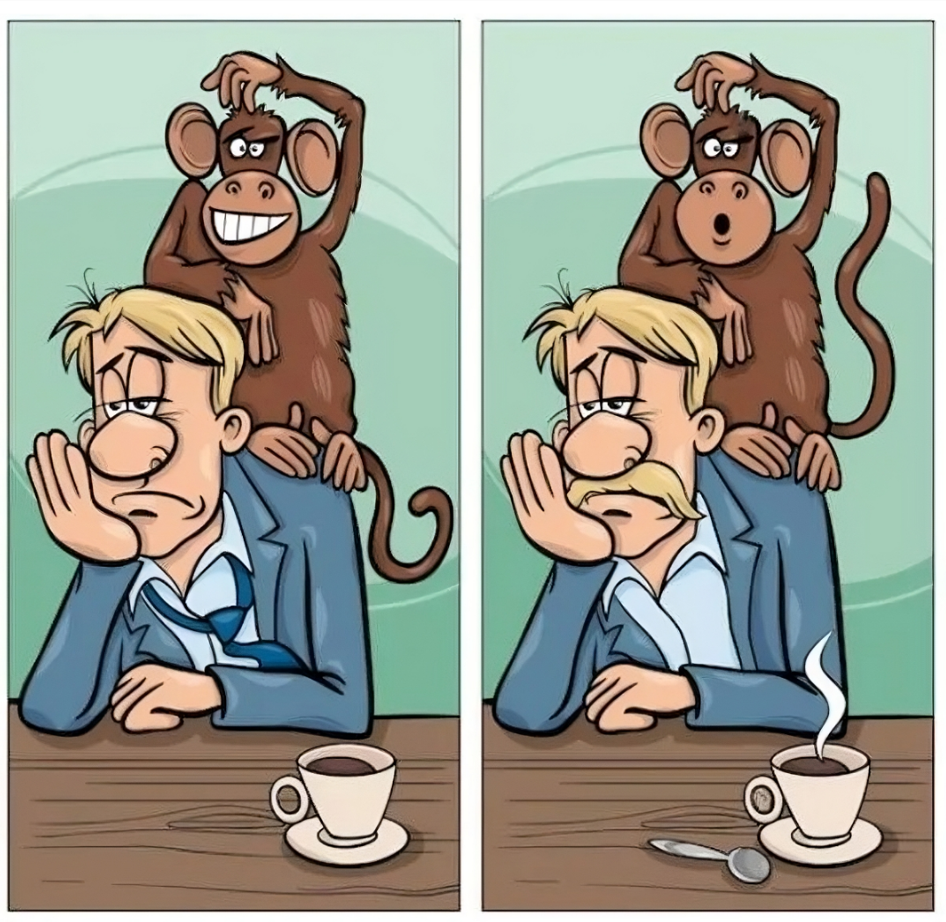 - Difference: The coffee cup handle has a missing line in the left image, while it’s complete in the right image.