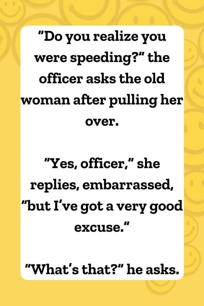 - Punchline: Not only is she aware of her speeding—she’s got the best reason ever.