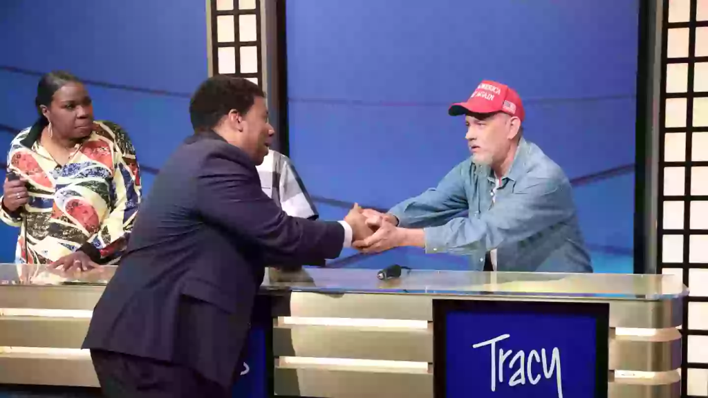During the anniversary special, Tom Hanks reprised his role as Doug, a Trump supporter wearing a MAGA (Make America Great Again) hat. In the sketch, Doug hesitated to shake hands with a character played by Kenan Thompson, then made a comment about starting a show called White Jeopardy.
