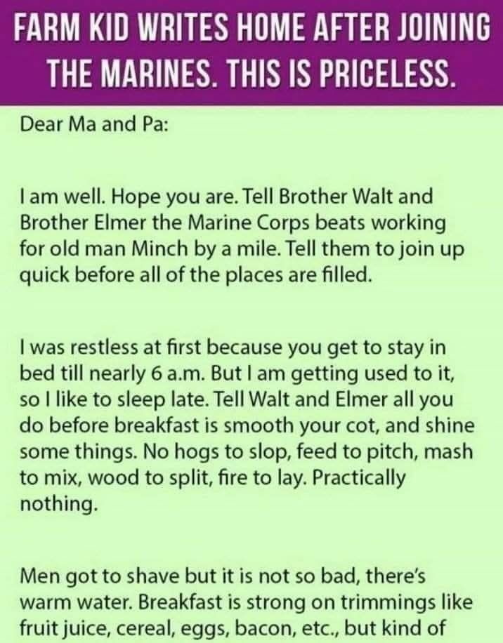 The letter wraps up with a loving (and hilarious) plea for her brothers to sign up. She paints Marine life as a dream gig: no chores, free meals, and medals just for doing what comes naturally to anyone raised on a farm.