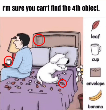 The image in question? A cozy scene with a man and his loyal dog, both lounging on a bed cluttered with leaves, petals, and all sorts of visual noise. Your mission, should you choose to accept it: locate a leaf, a cup, an envelope, and a banana cleverly camouflaged in plain sight.