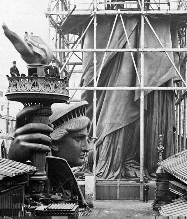 Piece by piece, Lady Liberty rose above the harbor.