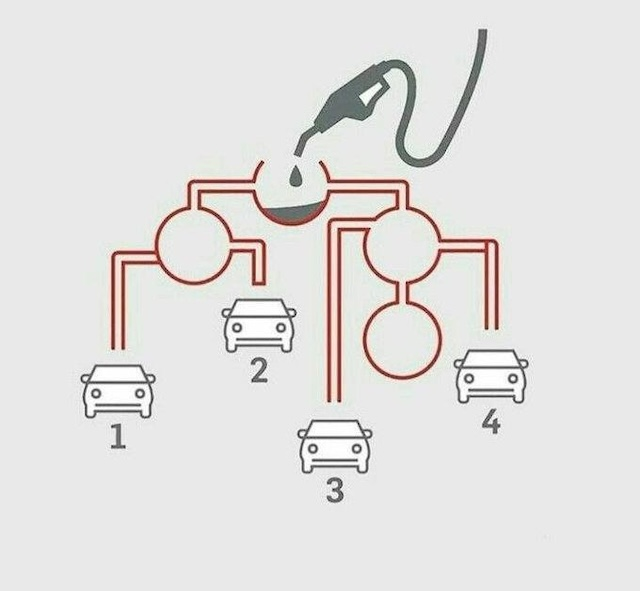 So, here’s the setup: You’ve got four cars lined up—Car 1, Car 2, Car 3, and Car 4—and they’re all connected by a maze of pipes to a single fuel tank. The goal? Figure out which car fills up first when the fuel starts flowing.