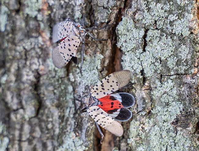 Spotted lanternflies lay egg masses that look like grayish mud splattered on tree trunks, outdoor furniture, rocks, or even your car. Scrape these off into a bag filled with hand sanitizer or rubbing alcohol. That way, the eggs won’t hatch in the spring and start the cycle all over again.