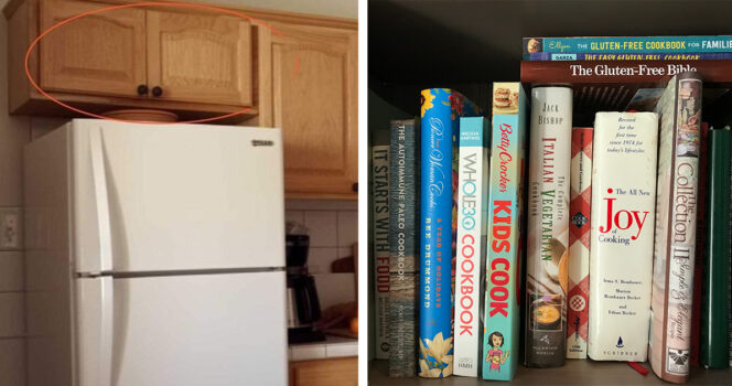 If you’re like me, you probably have a few cookbooks that you love but rarely use. Instead of letting them take up precious counter space, store them in the cupboard above your fridge. Arrange them by size or theme, so they’re easy to find when you need inspiration.