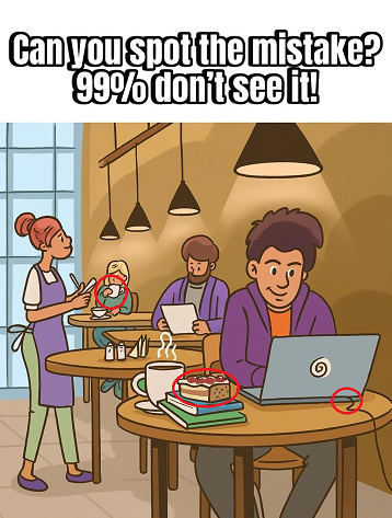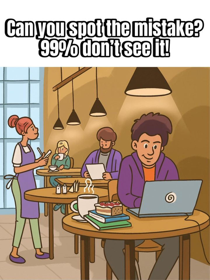 This cozy café puzzle is anything but simple. With a cake sitting on books, a laptop charging from the front, and a coffee cup being held all wrong, it’s a masterclass in how our minds overlook the obvious. But more than that, it’s a reminder of the power of slowing down, observing the world with fresh eyes, and challenging what we think we already know.