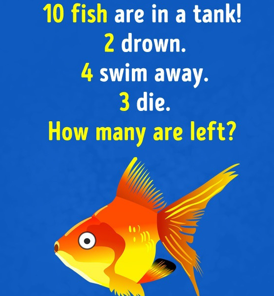 “10 fish are in a tank. 2 drown, 4 swim away, and 3 die. How many are left?”