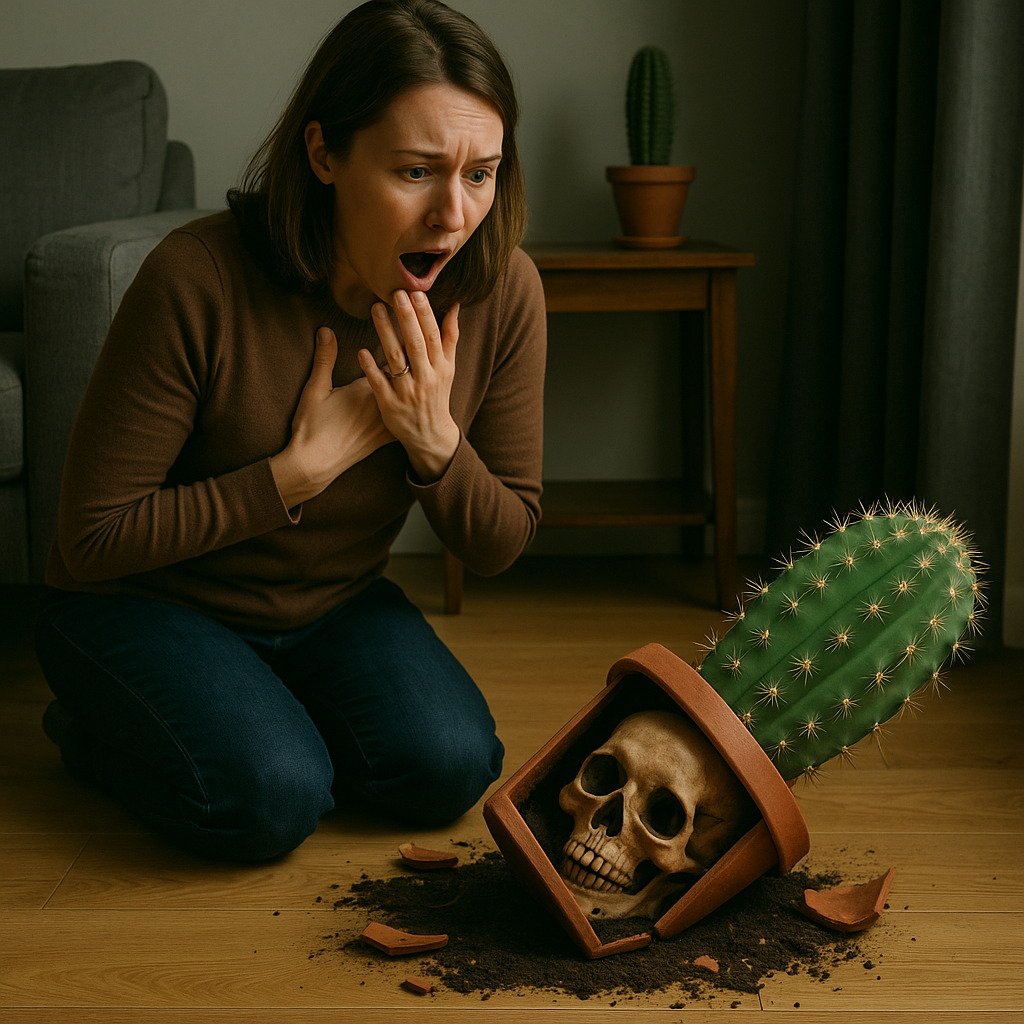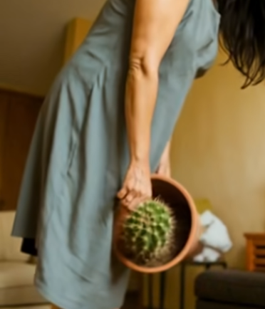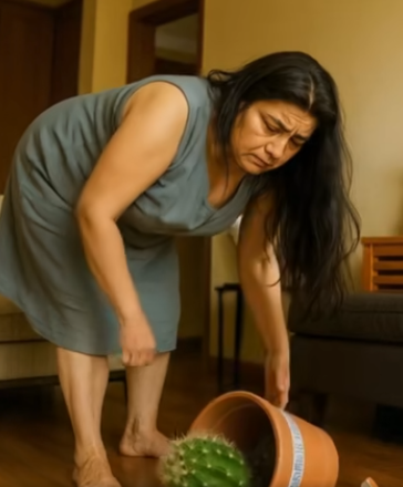 Wearing gardening gloves, she lifted the clay pot. As she glanced toward a framed wedding photo on the nightstand, her foot caught the edge of the rug. The pot slipped from her hands and crashed to the floor. Clay shattered, soil scattered across the hardwood, and the great cactus toppled with several spines broken.