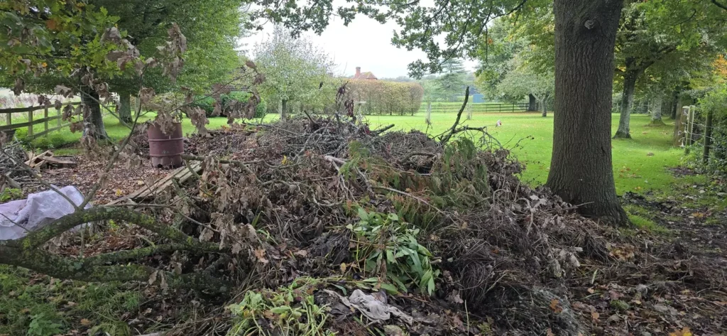 Begin by examining the lower part of the image, where the leaves, twigs, and branches are most dense. Look closely for unusual shapes or patterns that could indicate the presence of a dog.