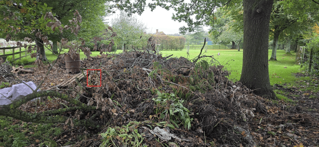 The spaniel is hidden beneath a branch, making it easy to miss at first glance. Focus on areas where branches cross each other, as this is often where the dog’s head is most likely to be.
