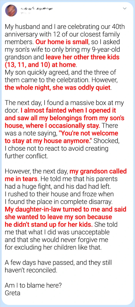 Greta’s request to limit the number of guests wasn’t meant to hurt anyone. With a packed home and limited space, she hoped to make the event more manageable. However, this decision inadvertently caused feelings of exclusion within her son’s family. Her daughter-in-law, understandably upset, felt her children were being treated unequally—an issue that often cuts deeper than surface-level disagreements.