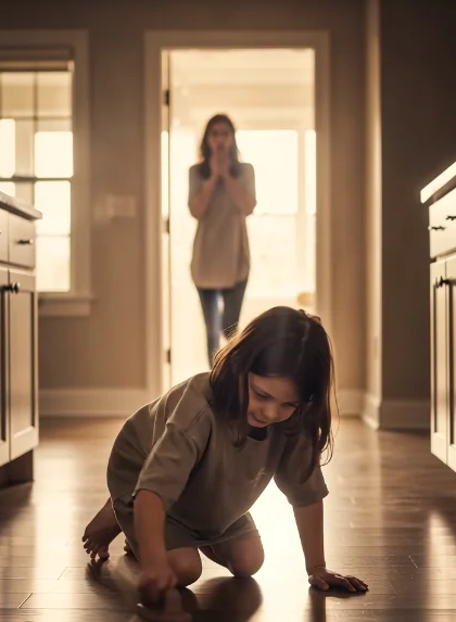 I found Evelyn in the kitchen. She was on her knees, wearing an oversized T-shirt, scrubbing the floor with a small rag. Alone. Nine years old.