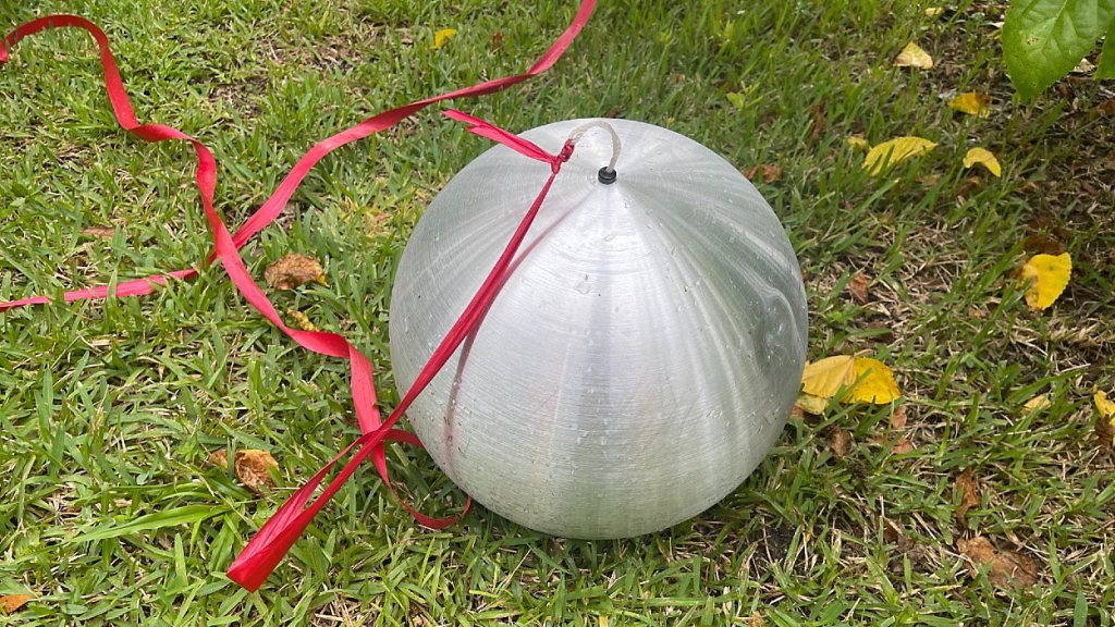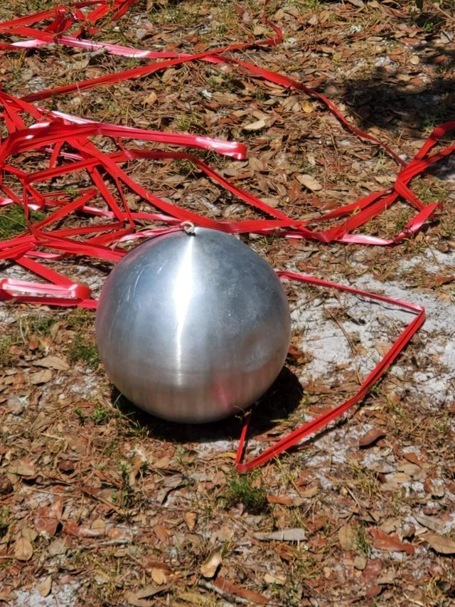 Radar calibration spheres are often released from airplanes or high-altitude balloons during tests. Once in the air, they drift downward with the help of a parachute, which explains the trailing ribbons. Because wind can carry them for miles, they can land in unexpected places—sometimes far from their original launch point.
