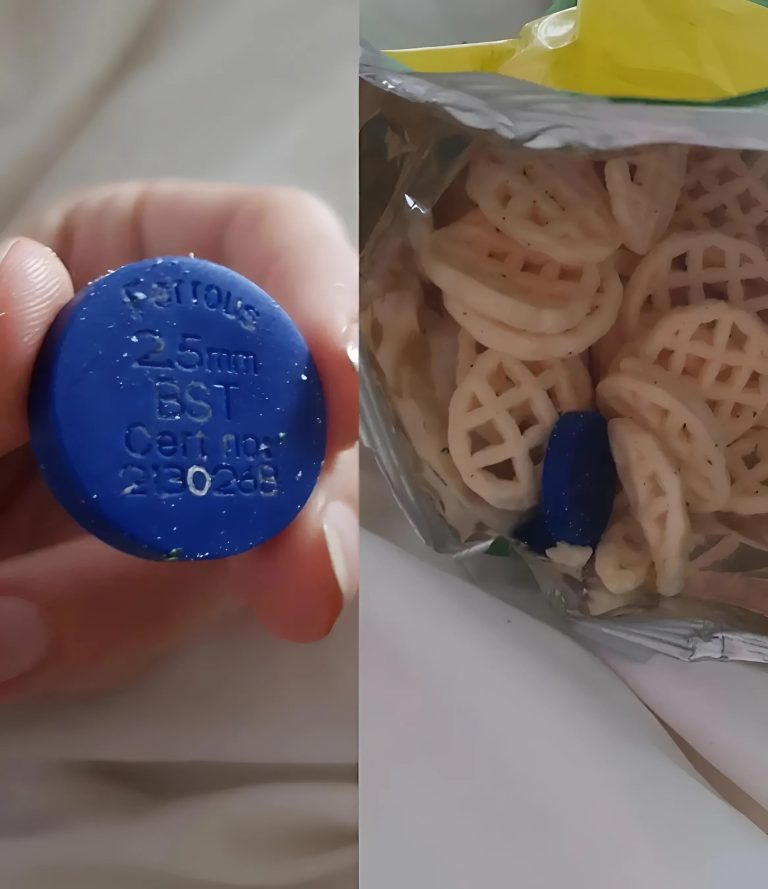 Surprisingly, the internet had a clear explanation. That strange little disc wasn’t part of the snack at all—it was something called a test chip, a tool used in food production plants. These chips are inserted into the assembly line to make sure metal detectors are working properly.