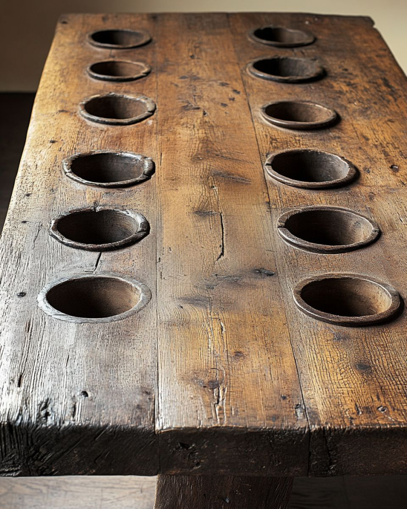 One of the most striking aspects of this antique table is its masterful design. Crafted from durable wood, the table was built to last, a necessity in a time when quality craftsmanship was the norm. But what sets it apart are the 12 built-in bowls that are perfectly spaced along its surface. These bowls are not simply an afterthought; they are integrated into the design in such a way that they complement the table’s overall form while serving a distinct purpose.