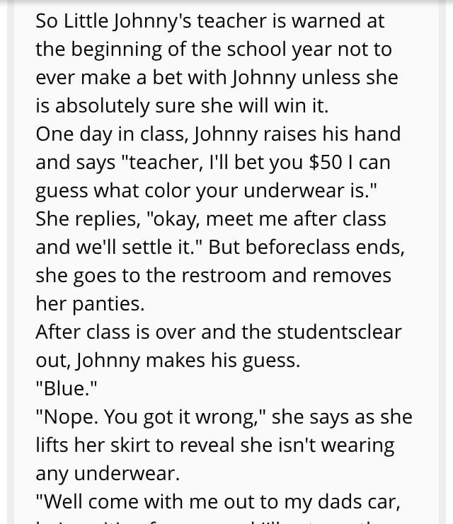 The teacher couldn’t help but smirk. “Nice try, Johnny. I’m not wearing any socks!”
