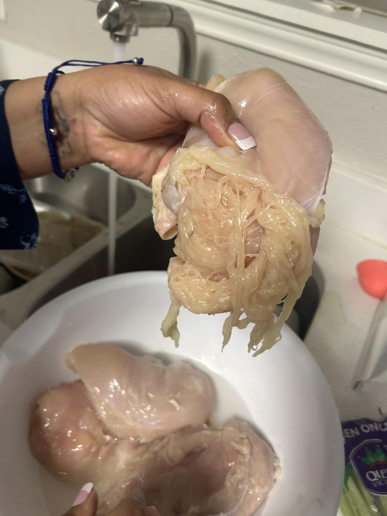 On March 21, Alesia Cooper, a mother of two from Irving, Texas, was preparing a simple dinner for her kids when she noticed something alarming. The chicken breast she had purchased from budget supermarket Aldi began shredding into stringy, noodle-like strands as she washed it. Shocked and disgusted, she shared a photo of the raw chicken on Facebook, where it quickly went viral.